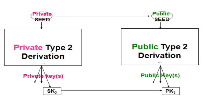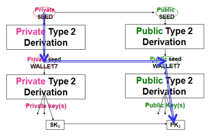 我们希望有2个推导函数。例如,无论是通过Public派生函数计算还是从SK3计算得出,PK3都应该相同,并且公共种子不应泄露私有种子或任何私有密钥,所有的推导函数都由单向函数来完成。