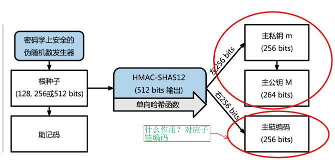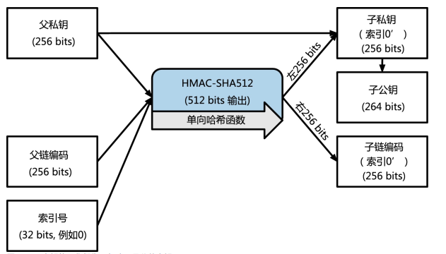 子秘钥的衍生方程式基于单向哈希方程,主要有以下几部分组成: