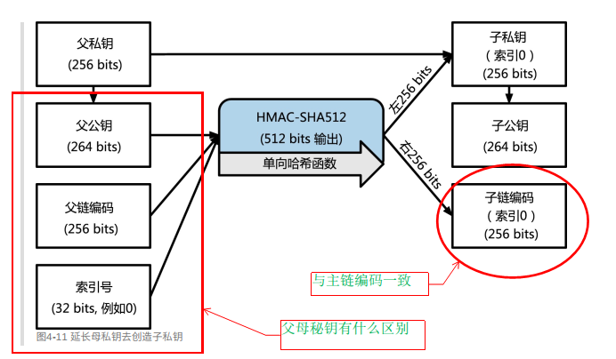 衍生:$(key_{child},chain_{codechild})=CKD((key_{parent},chain_{codeparent}),index)$ 这是扩展私钥的衍生过程对应于上图中的数据。扩展公钥的衍生过程与其同理。